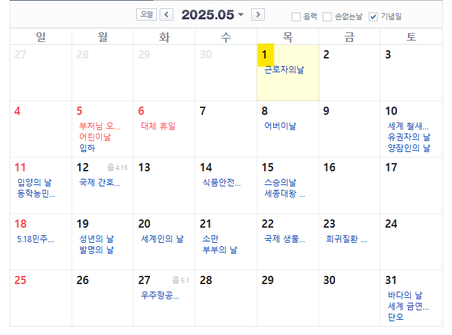2025년 5월 달력
